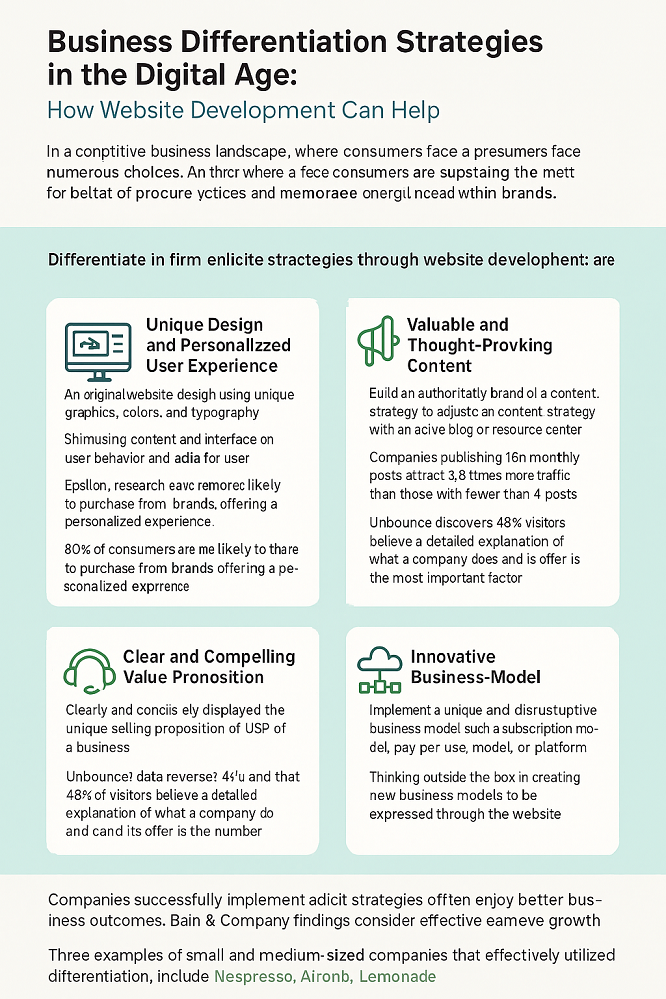 מודל עסקי חדשני ופורץ דרך - בידול באמצעות חדשנות: בניית אתר אינטרנט המשקף מודל עסקי ייחודי, יצירתי ופורץ דרך היא דרך נוספת ליצור בידול אפקטיבי ולכבוש נתחי שוק חדשים. זה יכול לכלול מודל מנויים גמיש עם רמות שונות של גישה ותכונות, מודל "תשלום לפי שימוש" המותאם לצריכה בפועל, שירותי ענן ייחודיים המציעים פתרונות חדשניים, או פלטפורמות תיווך חדשניות המחברות בין קונים ומוכרים בצורה שלא הייתה קיימת קודם לכן. שקלו שילוב של כלים אינטראקטיביים באתר המאפשרים למשתמשים להתנסות עם המודל העסקי הייחודי שלכם. חשיבה "מחוץ לקופסה" ביצירת מודלים עסקיים חדשניים שהאתר שלכם מאפשר יכולה לייצר יתרון תחרותי משמעותי ולמשוך קהלים חדשים.